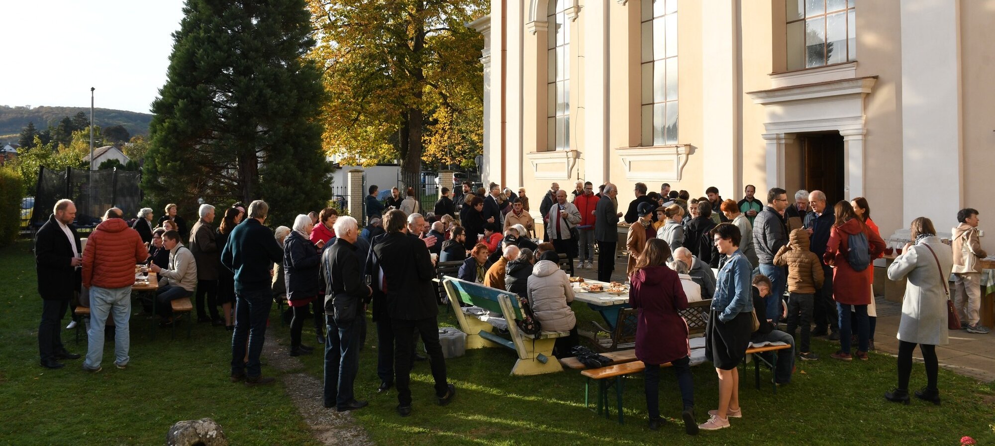 Po bohoslužbě následovalo neformální setkání v zahradě fary. Přestože byl už říjen, počasí nám přálo po celý den, a tak se poslední hosté rozcházeli až před setměním. Velkou radost nám udělalo i zapojení členů sboru, kteří připravili občerstvení, nachystali prostor farní zahrady, zajistili obsluhu i úklid po setkání. Není jednoduché hostit takové množství lidí – podle fotografií z kostela se akce účastnilo 160 až 170 hostů. Je krásné jednou za čas vidět zaplněný kostel. A ačkoliv jsme měli zpočátku obavy, zda budeme mít dost jídla a pití, ukázaly se jako zbytečné. Všeho bylo dost.