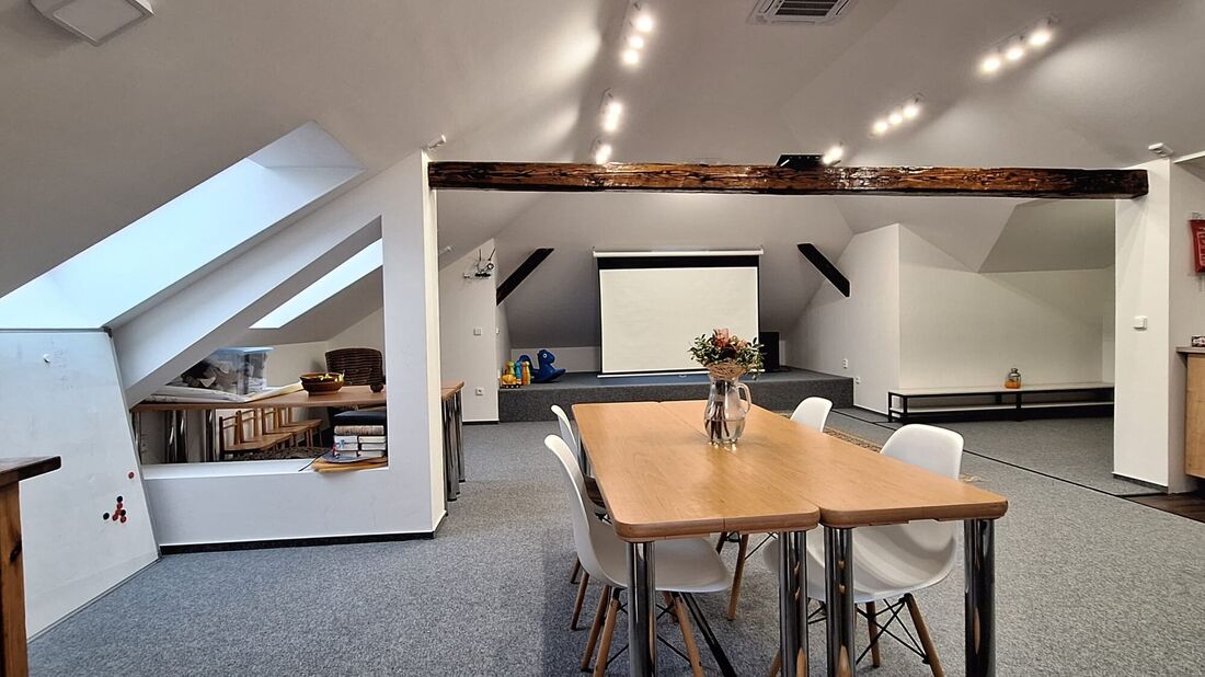 Podkroví je ideální na přenocování skupin do deseti lidí na vyvýšených pódiech s matraci, polštáři a peřinami. Součástí místnosti je taktéž místo na sezení, promítací plátno s projektorem, i menší kuchyňka s možností zapůjčení kavovaru, rychlovarní konvice, mikrovlnky a elektrického vařiče. součástí tohoto samoststného odděleného poschodí je i WC se sprchou s pračkou a přebalovacím pultem.