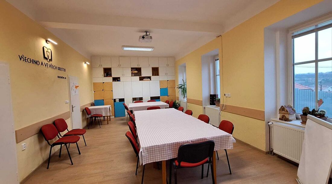 Pořádáte oslavu narozenin, oslavu výročí, rodinné setkání, nebo pouze hledáte prostory pro školení nebo konferenci? Naše sborová místnost je pro tyto účely ideální. Prostor a stoly lze různými způsoby přizpůsobit dle vašeho přání. Součástí místnosti je stropní projektor a promítací plátno. V případě potřeby je možné užívat naši kuchyňku na druhé straně chodby s dvěma profesionálními kávovary, lednicí, mikrovlnkou a elektrickým sporákem. Vše v bezbariérovém převedení.